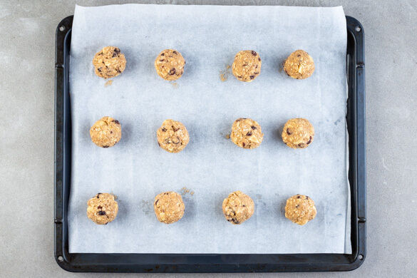 Den Backofen auf 195°C (175°C Umluft) vorheizen. Den Teig zu 24 gleich großen Kugeln formen und diese mit 6–7cm Abstand zueinander auf zwei mit Backpapier ausgelegte Bleche geben. Die Kekse 10–12Min. im Ofen backen, bis sie an den Rändern leicht gebräunt sind. Sie dürfen in der Mitte noch weich sein. Ggf. die Position der Bleche nach der Hälfte der Zeit tauschen.