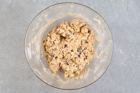 Die Mehlmischung in zwei Portionen zügig unterrühren. 200g Haferflocken, die Cranberrys und die Schokodrops vermengen, dann unter den Teig heben. Den Teig für mind. 30Min. oder über Nacht abgedeckt in den Kühlschrank stellen.