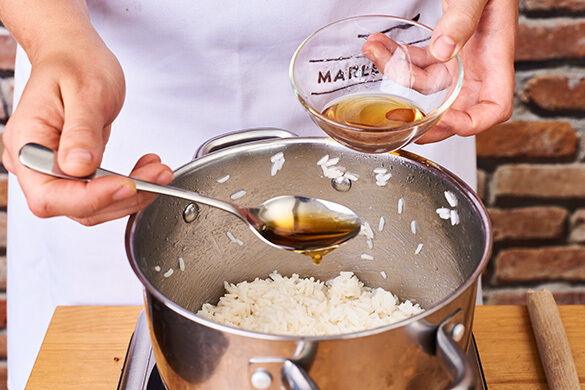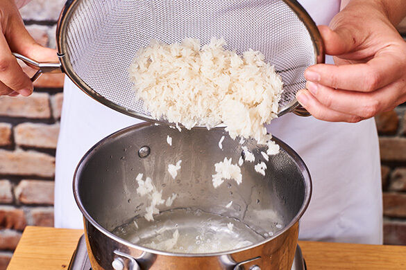 Den Reis in einem Sieb kalt abspülen, bis das Wasser klar bleibt. Sobald das Wasser kocht, den Reis hineingeben und abgedeckt bei niedrigster Hitze 10–12Min. kochen, bis das Wasser aufgesogen und der Reis gar ist. Noch ca. 5Min. ohne Hitzezufuhr ziehen lassen.