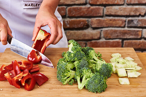 Den Brokkoli und die Paprika in derselben Pfanne bei mittlerer Hitze anbraten, ggf. etwas Pflanzenöl hinzufügen. Das Currypulver und etwas Wasser dazugeben und das Gemüse abgedeckt 6–7Min. köcheln lassen. Inzwischen einige Korianderblättchen abzupfen und für die Garnitur beiseitelegen, den restlichen Koriander samt Stängeln grob schneiden.