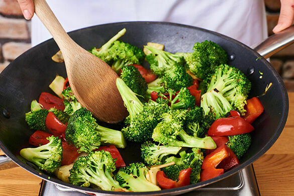 Den Tofu aus der Würzsauce nehmen und in einer großen Pfanne oder einem Wok mit 1–2EL Pflanzenöl bei starker Hitze 4–5Min. rundum anbraten. Inzwischen die Paprika vierteln, entkernen und in ca. 2cm große Stücke schneiden. Den Brokkoli in mundgerechte Röschen schneiden. Den Tofu aus der Pfanne nehmen und auf einem Teller beiseitestellen.