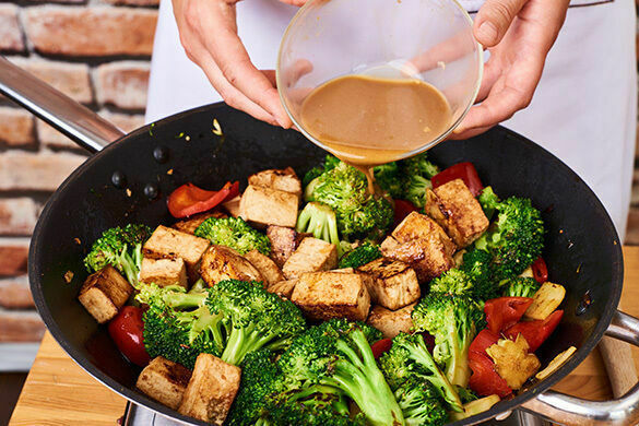 Die Würzsauce mit 100–150ml Wasser verrühren und mit dem Tofu unter das Gemüse mengen. Weitere 1–2Min. köcheln lassen, bis die Sauce eingedickt ist, dann mit Salz und Pfeffer abschmecken.