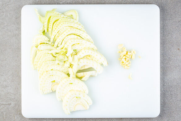 In einem Wasserkocher 700ml Wasser zum Kochen bringen. Den Fenchel längs halbieren und quer in ca. 1cm dünne Streifen schneiden, dabei den Strunk entfernen. Den Knoblauch schälen und grob würfeln.