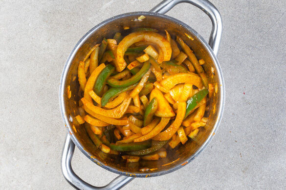 Die Paprika, den Fenchel, 1/2TL Paprikapulver sowie 1 kräftige Prise Salz in einem mittelgroßen Topf mit 2EL Butter bei mittlerer bis starker Hitze ca. 3Min. anbraten.