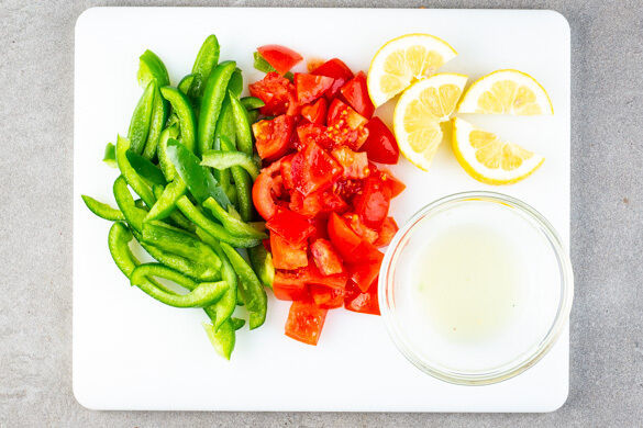Die Paprika vierteln, entkernen und in dünne Streifen schneiden. Die Tomaten in ca. 2cm große Würfel schneiden. Die Zitronen halbieren und eine Hälfte in Spalten schneiden, die anderen 3 Hälften auspressen.
