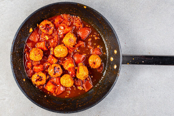 Die veganen Hackbällchen in einer großen Pfanne mit 2EL Olivenöl bei mittlerer bis starker Hitze in 3–4Min. rundum goldbraun braten. Den Knoblauch mit dem restlichen Paprikapulver dazugeben und ca. 1Min. weiterbraten. Die Tomaten mit 100ml Wasser sowie 1 Prise Salz einrühren und 6–8Min. köcheln lassen, bis die Sauce eingedickt ist.