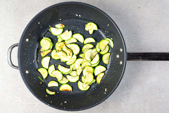 Die Zucchini unter gelegentlichem Rühren in einer mittelgroßen Pfanne mit 1EL Olivenöl bei mittlerer Hitze in ca. 6Min. goldbraun anbraten. Den Knoblauch und 1 kräftige Prise Salz hinzugeben und ca. 1Min. mitbraten.