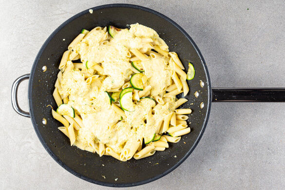 Den Backofen auf 240℃ (220℃ Umluft) vorheizen. In einem mittelgroßen Topf ausreichend gesalzenes Wasser für die Pasta zum Kochen bringen. Die Zucchini der Länge nach halbieren und quer in ca. 1cm dicke Scheiben schneiden. Den Knoblauch schälen und grob würfeln. Den Schnittlauch grob schneiden. Den Mais in ein Sieb gießen und abtropfen lassen.