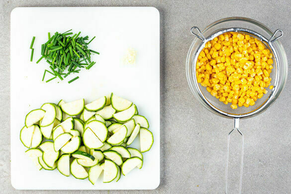 Den Backofen auf 240℃ (220℃ Umluft) vorheizen. In einem großen Topf ausreichend gesalzenes Wasser für die Pasta zum Kochen bringen. Die Zucchini der Länge nach halbieren und quer in ca. 1cm dicke Scheiben schneiden. Den Knoblauch schälen und grob würfeln. Den Schnittlauch grob schneiden. Den Mais in ein Sieb gießen und abtropfen lassen.