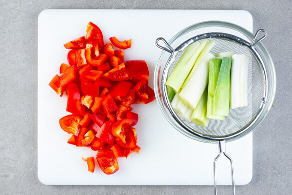 Den Backofen auf 220°C (200°C Umluft) vorheizen. In einem kleinen Topf ausreichend Wasser für die Eier zum Kochen bringen. Den Lauch längs halbieren und in ca. 6cm große Stücke schneiden. Die Paprika vierteln, entkernen und in ca. 2cm große Stücke schneiden.