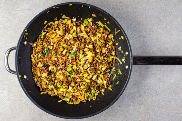 Das Hackfleisch in einer großen Pfanne mit 1EL Pflanzenöl bei starker Hitze ca. 2Min. anbraten. Den Lauch, den Knoblauch, 1/2TL Paprikapulver und je 1 kräftige Prise Salz und Pfeffer hinzugeben und 7–9Min. mitbraten. Nach Geschmack mit mehr Paprikapulver, Salz und Pfeffer würzen.