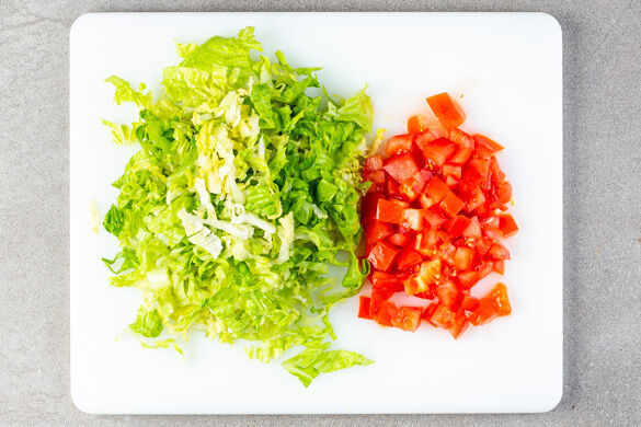 Den Romanasalat in dünne Streifen schneiden, dabei den Strunk entfernen. Die Tomate in ca. 1cm große Würfel schneiden.