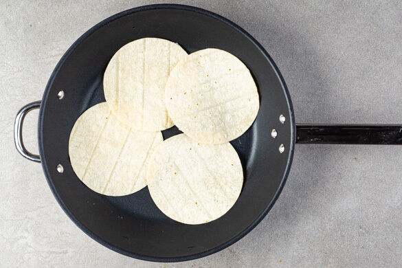 6 Tortillas nacheinander in einer zweiten großen Pfanne bei mittlerer Hitze auf jeder Seite ca. 15Sek. erwärmen, dabei dürfen sie ruhig leicht anbräunen.