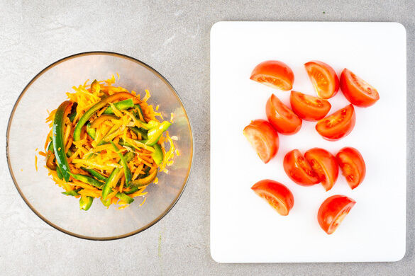 Die Karotte ggf. schälen und grob raspeln. Die Paprika vierteln, entkernen und in dünne Streifen schneiden. Die Karotten und die Paprika mit 1/2TL Salz und 1EL (hellem) Essig vermengen und beiseitestellen. Die Tomaten in Spalten schneiden.