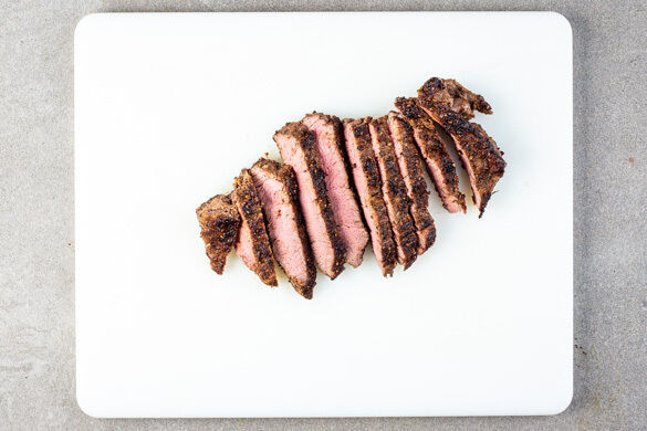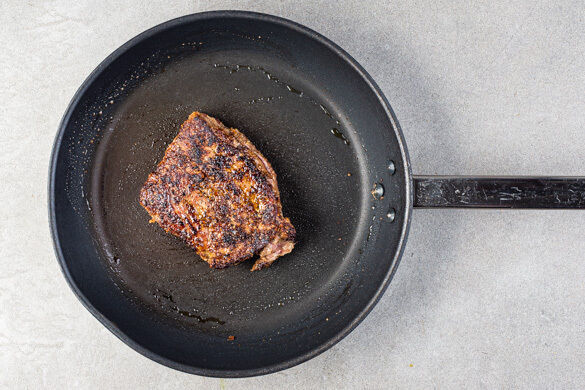 Das Fleisch in einer mittelgroßen Pfanne mit 1EL Pflanzenöl bei starker Hitze auf jeder Seite 2–4Min. scharf anbraten, je nach Dicke des Fleisches. Die Hitze reduzieren und das Fleisch noch 1–3Min. abgedeckt garen, je nachdem, ob es medium oder durch sein soll. Das Fleisch abgedeckt auf einem Teller ruhen lassen.