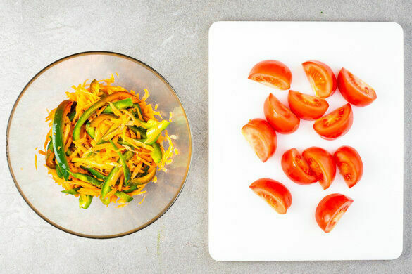 Die Karotten ggf. schälen und grob raspeln. Die Paprika vierteln, entkernen und in dünne Streifen schneiden. Die Karotten und die Paprika mit 1/2TL Salz und 1EL (hellem) Essig vermengen und beiseitestellen. Die Tomaten in Spalten schneiden.