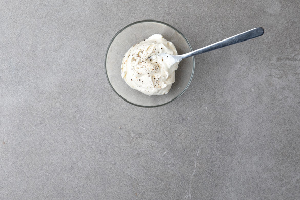 Die Crème fraîche glatt rühren und mit Pfeffer abschmecken.