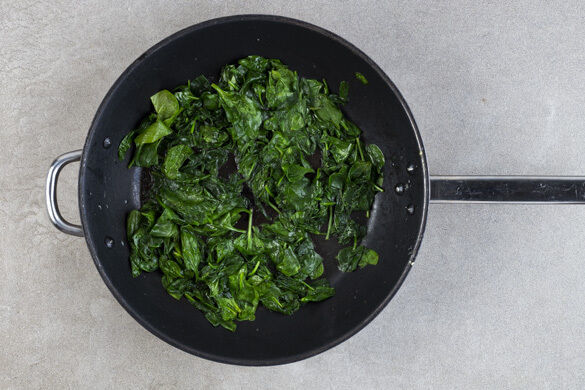 Den restlichen Knoblauch in einer großen Pfanne mit 1EL Olivenöl bei mittlerer Hitze ca. 1Min. anbraten, dann den Spinat und 4EL Wasser dazugeben und den Spinat abgedeckt in 3–4Min. zusammenfallen lassen. Mit Salz und Pfeffer würzen.