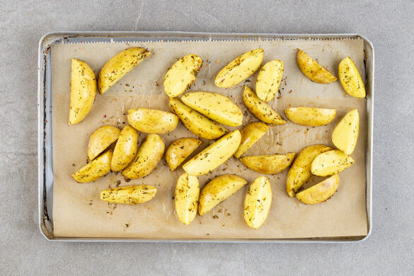 Den Backofen auf 240°C (220°C Umluft) vorheizen. Die Kartoffeln samt Schale je nach Größe halbieren oder vierteln.