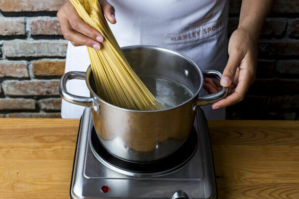 Inzwischen in einem großen Topf ausreichend gesalzenes Wasser für die Pasta zum Kochen bringen. Die Pasta in das kochende Wasser geben und in 7–9Min. bissfest kochen. In ein Sieb abgießen und abtropfen lassen.