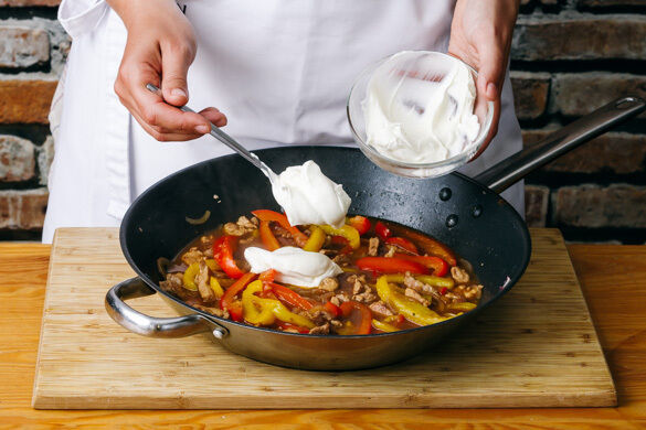 Die Paprika- und die Zwiebelstreifen hinzufügen und 2–3Min. mitbraten. Das Paprikapulver und das Brühgewürz unterrühren, mit 2EL Mehl bestäuben und mit 500ml Wasser ablöschen. Die Sauce abgedeckt bei mittlerer bis niedriger Hitze 20–25Min. sanft köcheln lassen.