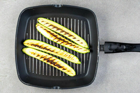 Die Zucchini längs vierteln und in einer Grillpfanne oder einer normalen Pfanne mit 1–2EL Olivenöl bei mittlerer bis starker Hitze in 4–5Min. rundum goldbraun braten. Die Zucchini aus der Pfanne nehmen und in 2–3cm große Stücke schneiden.
