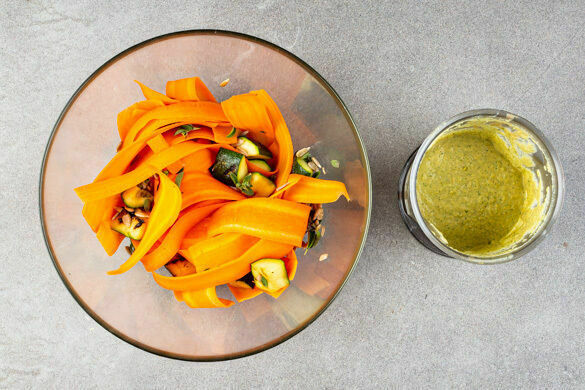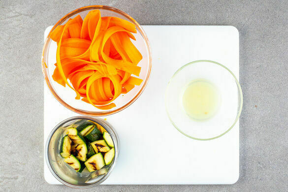 Die Karotten ggf. schälen und mit einem Sparschäler in dünne, breite Streifen schneiden. Den Knoblauch schälen, die Zitronenschale abreiben, dann die Zitrone halbieren und auspressen. Die 1/2 der Zucchini mit dem Knoblauch, der Zitronenschale und der 1/2 des Zitronensafts in ein hohes Gefäß geben.