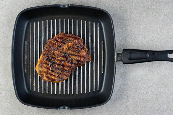 Das Fleisch in derselben Pfanne bei starker Hitze auf jeder Seite 3–4Min. scharf anbraten. Aus der Pfanne nehmen, nach Belieben mit Salz und Pfeffer würzen und bis zum Servieren auf einem Teller abgedeckt ruhen lassen.