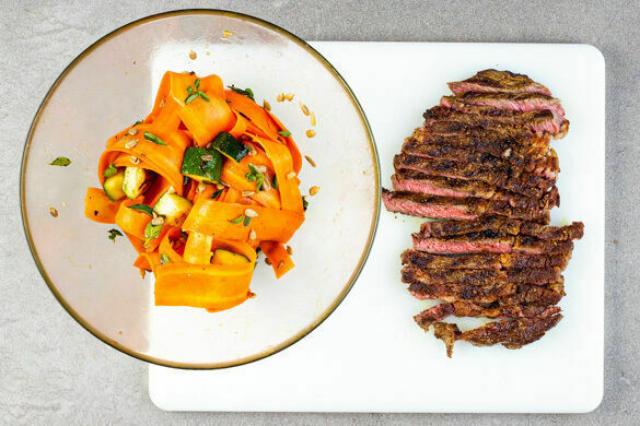 Wenig Kohlenhydrate, aber ein echtes Verwöhnprogramm bereitest du dir, wenn du das Rindersteak mit köstlicher Gewürzkruste in der Pfanne brutzelst und später in ein edles Hummus aus Sesampaste und Zucchini dippst. Auch ein aromatischer Salat mit gegrillter Zucchini und frischen Majoranblättern möchte sich gerne liebevoll um deine Geschmacksknospen kümmern. Das klingt nach Luxus pur, also bitte: Programm, Start!