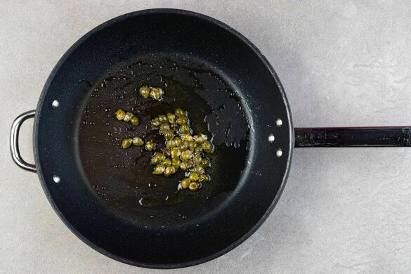Die Kapern trocken tupfen und in einer großen Pfanne mit 3EL Olivenöl bei mittlerer bis starker Hitze 2–3Min. kross frittieren. Die Kapern herausnehmen und auf etwas Küchenkrepp abtropfen lassen.