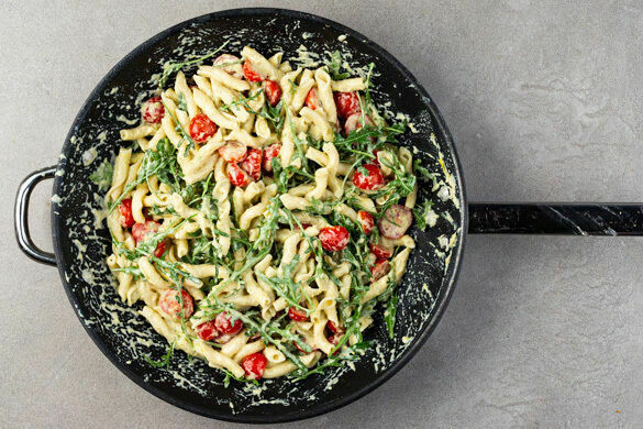 Ein Glück, dass Torchiette-Nudeln dank ihrer attraktiven Blütenform extra viel Sauce aufnehmen können! Denn von dieser seidig-cremigen Thunfischsauce, die mit Lauch und Crème fraîche verfeinert wird, möchten wir keinen Tropfen verschwenden. Als Highlight wird die Pasta mit frittierten Kapern bestreut, die so richtig schön knuspern und herrlich säuerlich-pikant schmecken. Begeistert rufen wir: Tutto bene!