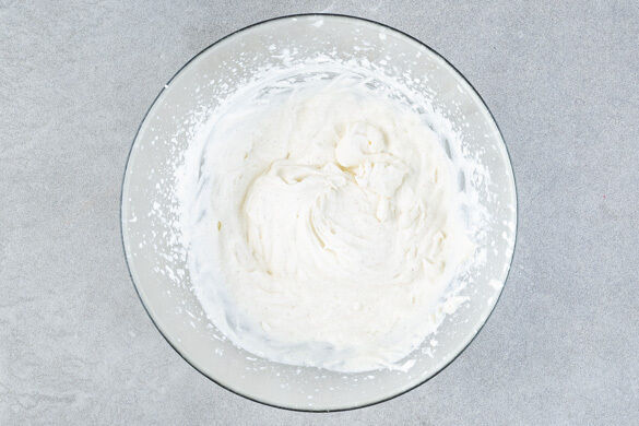 Die Schlagsahne, den Puderzucker, den Vanillezucker und 1 Prise Salz mit einem Handrührgerät sehr steif schlagen, damit der Cheesecake später ausreichend fest wird. Tipp: Die Sahne ist steif, wenn sie nach dem Schlagen nicht zusammenfällt.