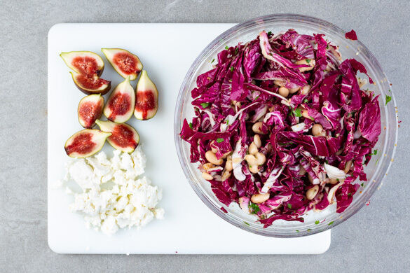 Den Radicchio-Bohnen-Salat mit je einem Klecks Paprika-Walnuss-Creme anrichten und die Feigen darauf verteilen. Mit dem Feta, den restlichen Walnüssen und der restlichen Petersilie garnieren und servieren.