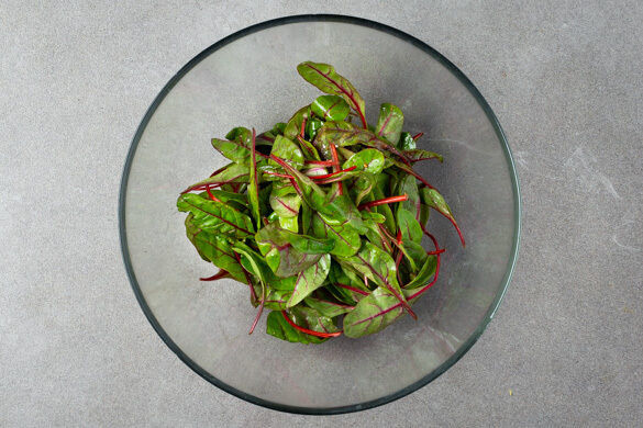 In einem kleinen Topf 400ml leicht gesalzenes Wasser für den Reis zum Kochen bringen. In einem zweiten Topf ausreichend Wasser für die Eier aufkochen. Die Chioggia-Bete schälen und in möglichst dünne Scheiben schneiden. 2–3EL Essig mit 1EL Wasser, 1TL Zucker und 1/2TL Salz verrühren, bis sich Zucker und Salz aufgelöst haben, dann die Bete-Scheiben untermengen.