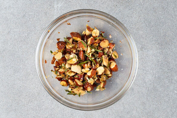 Den Knoblauch mit der flachen Seite eines Messers leicht zerdrücken, schälen und mit den Rosmarinzweigen in der mittelgroßen Pfanne mit 1EL Olivenöl bei mittlerer bis starker Hitze 1–2Min. anbraten, bis der Knoblauch leicht gebräunt ist, dabei gelegentlich umrühren. Den Rosmarin und den Knoblauch aus der Pfanne nehmen und beiseitestellen.