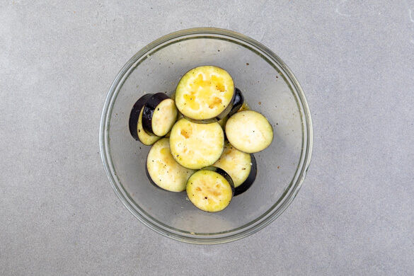 Den Backofen auf 240°C (220°C Umluft) vorheizen. Die Auberginen in ca. 2cm dicke Scheiben schneiden. Den Knoblauch schälen und fein würfeln. 1 Orange halbieren und 1 Hälfte auspressen. Den Orangensaft mit dem Knoblauch, 3EL Olivenöl und je 1 kräftigen Prise Salz und Pfeffer verrühren und die Auberginen untermengen.