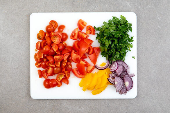 Die Kirschtomaten vierteln. Die Tomate in Spalten schneiden. Die Petersilie samt Stängeln grob hacken. Die Zwiebel schälen, halbieren und in feine Streifen schneiden. Die übrigen Orangen so schälen, dass auch die weiße Haut entfernt wird, dann das Fruchtfleisch in grobe Stücke schneiden.
