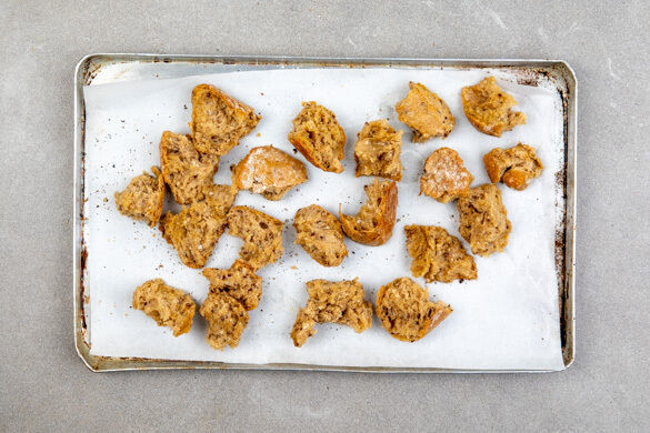 Das Brötchen in mundgerechte Stücke zupfen, auf einem mit Backpapier ausgelegten Backblech mit 1EL Olivenöl beträufeln, mit je 1 Prise Salz und Pfeffer würzen und 5–6Min. im Ofen goldbraun und knusprig aufbacken.