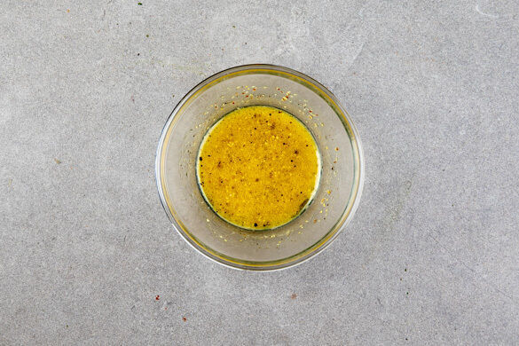 Ca. 2/3 des Senfs mit 2EL Olivenöl, 1–2EL (hellem) Essig und 1/2TL Zucker verrühren und das Dressing mit Salz und Pfeffer abschmecken.
