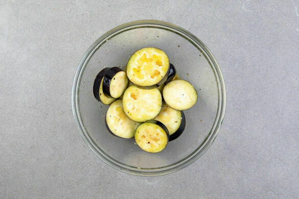Den Backofen auf 240°C (220°C Umluft) vorheizen. Die Auberginen in ca. 2cm dicke Scheiben schneiden. Den Knoblauch schälen und fein würfeln. 1 Orange halbieren und 1 Hälfte auspressen. Den Orangensaft mit dem Knoblauch, 4EL Olivenöl und je 1 kräftigen Prise Salz und Pfeffer verrühren und die Auberginen untermengen.