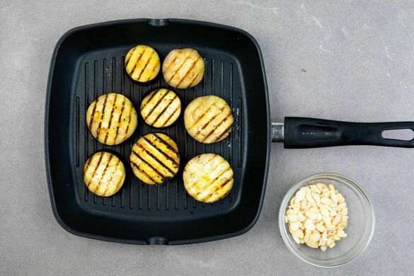 Die Auberginen in einer Grillpfanne oder einer normalen Pfanne unter regelmäßigem Wenden 8–10Min. braten, bis die Auberginen gar und schön gebräunt sind. Mit Salz und Pfeffer würzen. Parallel die Mandeln in einer kleinen Pfanne ohne Zugabe von Fett bei mittlerer Hitze 1–2Min. goldbraun anrösten. Anschließend grob hacken und beiseitestellen.