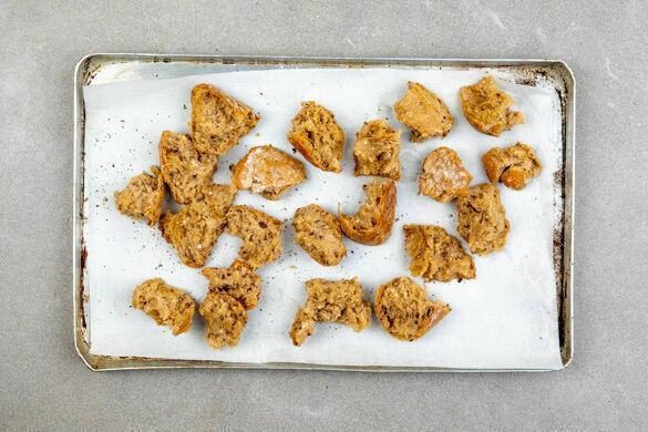 Die Brötchen in mundgerechte Stücke zupfen, auf einem mit Backpapier ausgelegten Backblech mit 2EL Olivenöl beträufeln, mit je 1 Prise Salz und Pfeffer würzen und 5–6Min. im Ofen goldbraun und knusprig aufbacken.