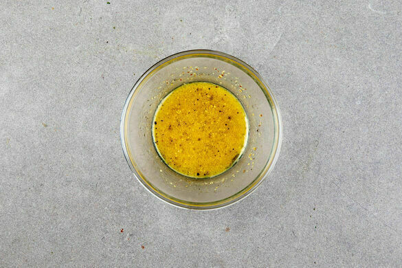 Den Senf mit 3EL Olivenöl, 2EL (hellem) Essig und 1TL Zucker verrühren und das Dressing mit Salz und Pfeffer abschmecken.
