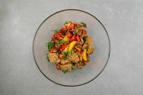 Der kann was, dieser Brotsalat. Mit knusprigem Mehrkornbrot, gerösteter Aubergine, fruchtig-süßer Orange und leckeren Tomaten ist er genau das Richtige an einem sommerlichen Abend. Frische Petersilie und Mandelblättchen dürfen als Verfeinerer ran. Ob allein zu zweit oder als Beilage zum Grillabend – mit diesem Salat macht ihr nichts falsch!