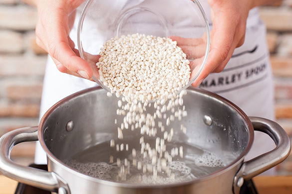Großen Kochtopf mit ausreichend gesalzenem Wasser zum Kochen bringen. Perlgraupen zugeben und ca. 20-30Min. bissfest gar kochen. Mandeln in etwas kaltem Wasser einweichen.