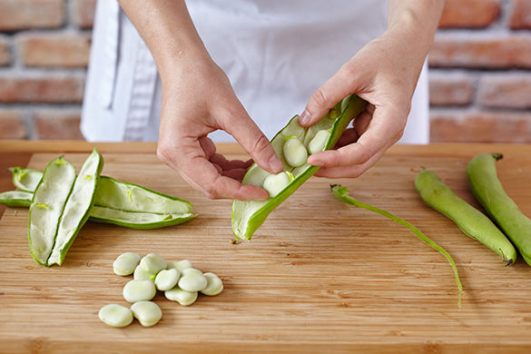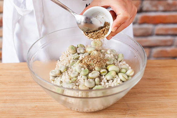 Inzwischen die Bohnen aus der Schale pulen und die letzten drei Minuten der Perlgraupen-Kochzeit mit in das Wasser geben, gar kochen. Wasser abgießen und im Sieb abtropfen lassen.