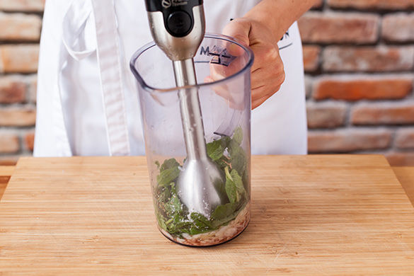 Radieschen waschen, Enden entfernen und den Rest in feine Scheiben schneiden. Petersilie waschen, harte untere Stiele entfernen und Blätter fein hacken. Beides vermengen und mit einer Prise Pfeffer würzen. Minze waschen und die Blätter abzupfen.