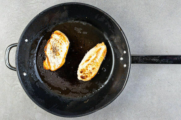 Das Fleisch trocken tupfen, horizontal halbieren und mit je 1 Prise Salz und Pfeffer würzen. In der Pfanne mit 2EL Olivenöl bei mittlerer Hitze auf jeder Seite 2–3Min. anbraten. Sobald das Fleisch in der Mitte durch ist, das Fleisch samt Bratensaft aus der Pfanne nehmen und beiseitestellen.
