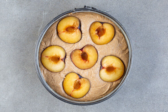 Den Teig in die Form füllen. Die Pflaumen mit der Schnittseite nach oben auf dem Teig verteilen und sanft nach unten drücken, sodass Pflaumen und Teig eine ebene Schicht bilden. Übrige Pflaumen ggf. für das Kompott aufbewahren. Den Kuchen 35–40Min. im Ofen goldbraun backen. Tipp: Der Teig darf um die Pflaumen herum ruhig noch etwas feucht sein.
