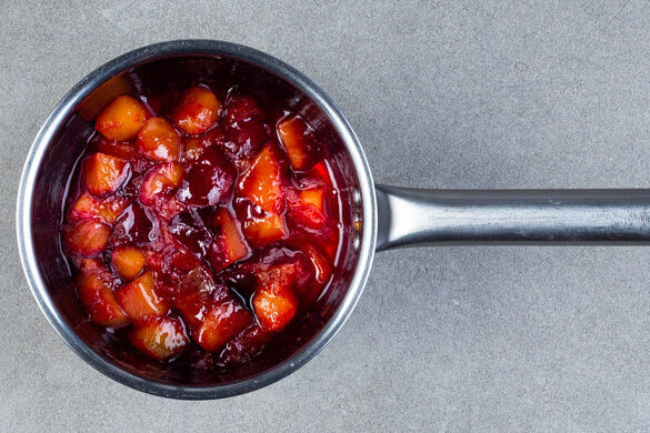 Die Nektarine in ca. 2cm große Stücke schneiden, den Stein entfernen. Übrige Pflaumen ggf. ebenfalls in ca. 2cm große Stücke schneiden. Die Früchte samt ausgetretenem Saft in einen kleinen Topf geben, 2EL Zucker sowie 2EL Wasser hinzufügen und bei mittlerer Hitze 5–7Min. einköcheln lassen, bis die Früchte weich sind, dabei gelegentlich umrühren.